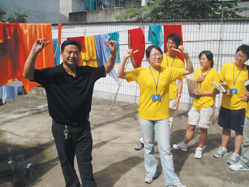 7月13日,浙江财经学院东方学院的暑期实践团一行8人来到位于黄泽镇官园村的市越剧艺术中心一团,进行为期一个星期的关于民营剧团发展状况的调查。 图为学生们在越剧艺术中心一团团长的指导下,摆起了小生的基本架势。