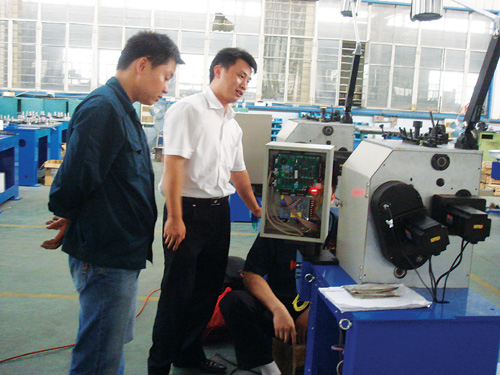 浙江万能弹簧机械有限公司是一家专业生产电脑弹簧机械及配套产品设备的省高新技术企业,集弹簧机械测试、科研、开发于一体,目前已拥有电脑数控卷簧机、电脑数控磨簧机、自动卷簧机、回火炉等六大系列三十多个品种。产品已获国家专利,连续5年获中国零部件协会优秀新产品奖,被列为省级弹簧机械重点龙头企业。由于该公司一直以来十分重视产品的研发,不断问世的新产品已进入欧洲及东南亚等市场,销售势头很好。图为技术人员正在调试新产品。
