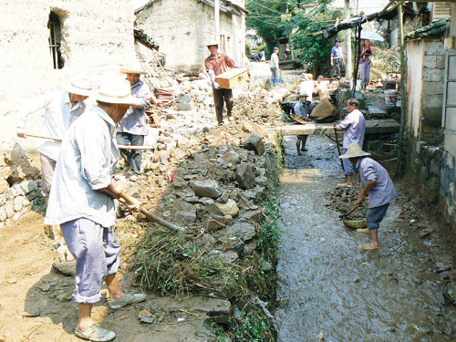 6月23日,里南乡下叶村村民正在对小流域洪灾后倒塌的房屋及道路进行清理。6月21日晚上的强降雨使我市部分地区受灾,据不完全统计,全市直接经济损失1500万元以上。面对灾情,社会各界纷纷伸出援助之手,受灾群众也积极开展灾后重建工作。