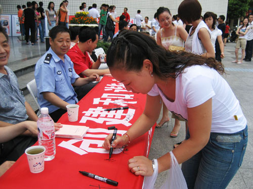 昨日是国际禁毒日,我市公安局联合政法委、法院、检察院、司法局等相关部门举行了大型禁毒宣传咨询活动,通过展示图片、分发宣传资料,组织群众在“打击毒品犯罪、创建和谐社会”横幅上进行千人签名活动等,达到让群众了解认识毒品危害、预防抵制毒品的目的。 图为一位市民在“打击毒品犯罪、创建和谐社会”横幅上签名的场景。