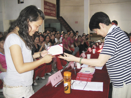6月30日,市越剧艺术学校2007届毕业生举行了毕业典礼,34名学员喜获毕业证书。据了解,这34名学生早在去年都已找好了工作,分别赴4个专业越剧团和5个民营越剧团就业,将对传承我市越剧艺术起到积极作用。图为一学员接过毕业证书的场景。