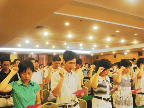 6月29日上午,来自全市各条战线的200多名新党员在嵊州宾馆多功能厅参加入党宣誓仪式,市直机关党工委希望新党员牢记入党誓言,充分发挥共产党员的先进性,为我市“工业强市、和谐惠民”,率先实现全面小康社会而努力奋斗。
