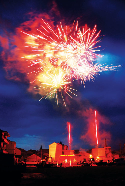近日,我市城乡各地举行各种群众文化活动,喜庆“七一”建党节。图为6月28日晚上,长乐镇永红村举行焰火晚会时的场景。