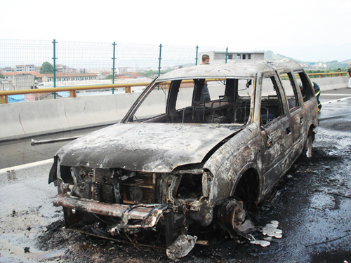 7月7日下午近1时,甬金高速往义乌方向(嵊州桥上),一辆牌照为浙·GNM353的商务车突然起火,没几分钟,商务车基本被烧成了光架(如图),所幸无人员伤亡。 接到报警后,市消防大队7名指战员立即乘坐消防车赶往火场。当消防队员赶到现场时,该商务车已被火焰包围,肆虐的火魔吞噬着该车。指挥员当即下令展开战斗,出一支水枪冷却油箱,并设法打开引擎盖对发动机进行灭火和降温。经过5分钟的紧张扑救,大火迅速被扑灭,但车子已被烧得面目全非。 据驾驶员何师傅反映,他驾车从宁波开往义乌,当车辆行驶到嵊州段时,突然发现引擎盖下冒出了白烟和火苗,他立即将车停靠在路边下车求救,由于车上没有配灭火器,周围又没有可利用的水源,火势立即扩大,变得不可收拾。对此,何师傅感叹地说:“假如车上有个灭火器就好了!当初省什么也不该省买灭火器的几十元钱啊。”