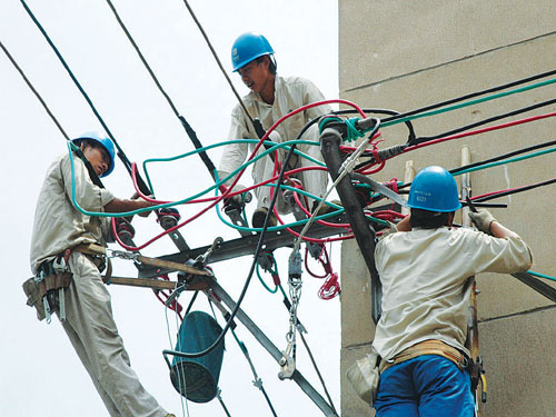 从6月29日起,我市进入35℃以上的持续高温天气,用电负荷随之一路走高,最高用电负荷突破24万千瓦,创同期历史新高。因负荷大幅增加,近期事故抢修也相应增加,烈日高温考验着城市电网,更“烤验”着电力抢修人员的敬业精神。图为7月8日中午,酷暑难耐,室外气温已达40℃以上,电力抢修人员正在文星东路排除故障。