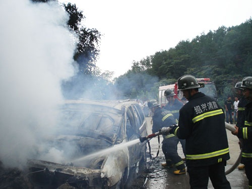7月14日上午9时许,车牌号为浙DH8760的福特商务车行驶在若花线往崇仁方向的路段时,一辆摩托车迎面而来,为了避免与其发生相撞,福特车司机只好向右猛打方向盘,福特车与公路右边的山体岩石发生碰撞,司机童某赶紧下车,随着“轰”的一声巨响,福特车车头燃起了熊熊大火。 9时41分,市消防大队接到“110”指挥中心命令:“若花线往崇仁方向有一辆车子起火,请迅速前往扑救!”接警后,消防队员火速赶到事发现场,只见一辆牌照为浙DH8760的福特稳达商务车正在猛烈燃烧,烈焰包围了整个车身。消防指挥员考虑到油箱很有可能在烈焰的炙烤下爆炸,为避免伤及群众,指挥员果断命令:一组队员马上对现场进行封锁,禁止任何车辆通行,以免发生不必要的伤亡;另一组队员迅速出一支水枪开始灭火。由于车辆正处于猛烈燃烧阶段,消防队员们采取了先远攻后近战、逐步推进的办法,迅速将火势控制。短短5分钟后,车厢外部的明火被扑灭,在确保安全的情况下,一名战士用撬棍将轿车前引擎盖撑起,将残火彻底扑灭。 笔者在现场看到,整个福特车已被烧得面目全非,只剩下一个空架子。据司机童某反映,他驾驶该车行驶至此路段时,突然一辆摩托车迎面开来,为避免与其交锋,童某只好向右猛打方向盘,由于没有把握好方向盘,导致车子撞山并引发发动机起火,所幸自己没有受伤。目前,事故原因还在进一步调查之中。