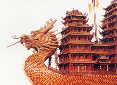 1989年,在全国工艺美术品百花奖上被评为创新设计一等奖的竹编《龙舟》,堪称竹编建筑工艺品中的魁首。《龙舟》在布局上,突出了舟上的九层楼阁建筑:亭角殿顶,高底参差;回廊走道,曲折多变;栏杆挂落,玲珑剔透;灯彩流苏,典雅华贵。《龙舟》全长196厘米,高152厘米,整座作品充分发挥了竹编技艺中的特长,龙头和楼阁的建筑体面都用精细的篾丝编成,九层楼阁的编织法层层不同,却又和谐地统一在整体之中。门框、轩窗、天花藻井和地面,不仅编织精巧典雅,而且丝丝人扣,衔接无缝。楼阁的正脊、戗脊、吻兽、套兽、飞挑,装饰着各种姿态的龙纹,它和编织紧密的金黄色筒瓦相辅相成,轩昂华美。