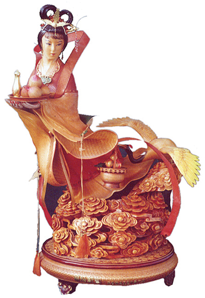 竹编《麻姑献寿》以精致华贵见长。麻姑形象端庄秀丽,体态轻盈,她脚踏五彩祥云,手托精致圆盘,盘内放着寿酒和寿桃,喜滋滋地去给王母祝寿。两只洁白晶莹、雄健高雅的丹顶仙鹤,衔着麻姑飘起的彤红彩带,萦绕在她的周围。作品于1979年完工,是建国三十周年的献礼佳品。