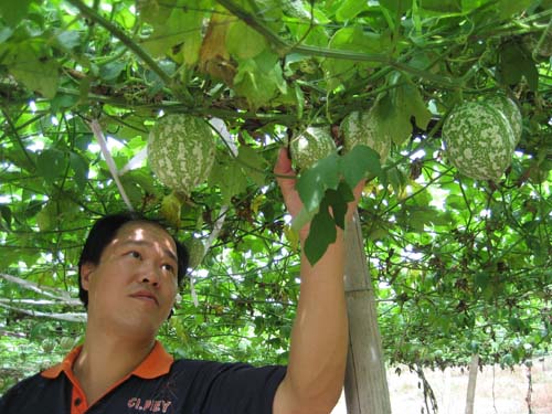 这几天,尽管天气很热,但剡湖街道长地村村民张林福都要冒着毒辣辣的太阳上山去自己的吊瓜园里看看。望着那漫山遍野绿茵茵的吊瓜棚及棚下那一个个拳头大小的吊瓜,张林福心里挺高兴的。他告诉记者,只要不出意外,这片吊瓜今年会有10万元的收入。 吊瓜学名叫栝楼,秋天成熟后,收获的籽制成炒货,很受市场欢迎。因此种植吊瓜经济效益很好,每公斤吊瓜籽的售价在二三十元左右。 张林福从2005年开始种植吊瓜。那一年,长地村经过园地整理,开发了近80亩的荒山,张林福承包了这块山地,并一口气承包了20年。尽管“吃下”了这块荒山,但如何把荒山变成“金山”,张林福心中没有底,正当他为种什么作物发愁的时候,他在长兴县工作的一个朋友给他出主意,让他试试种植吊瓜。吊瓜是长兴县的特产,张林福的朋友告诉他,从作物的习性看,应该适合在张林福承包的这块山地种植。 因为嵊州还没有吊瓜种植,张林福特地去长兴县考察,在了解市场形势、学习了栽培和种植技术后,他从长兴县引进了吊瓜的秧苗。 经过一年的精心管理,吊瓜长势不错。但是,由于中途遇到台风,吊瓜棚都被台风刮倒。 当年只收获了少量吊瓜籽,卖了仅1万元。但张林福没有气馁,继续精心管理着吊瓜。去年,由于天公不作美,连续干旱,灌溉没有跟上,吊瓜被晒,产量又减低。但这一年他还是卖了5万多元。 良好的市场形势,给了张林福更多的信心。经过两年的尝试,今年他的经验更足了,吊瓜园也没有辜负他的期望,长势喜人,丰收在望。