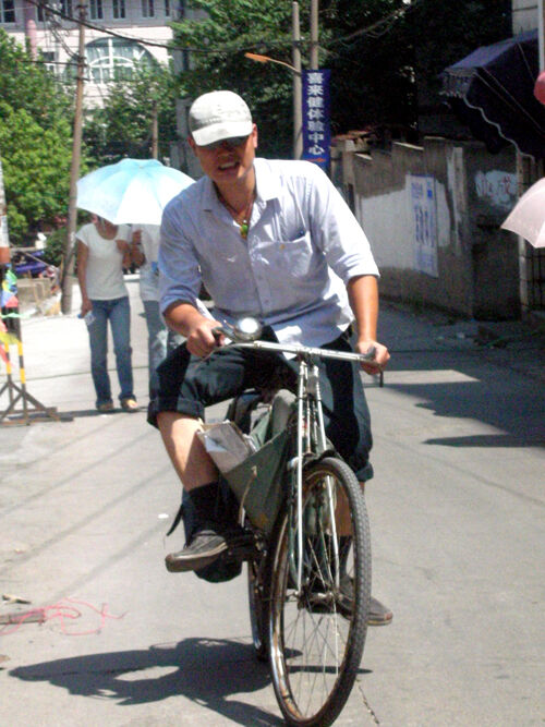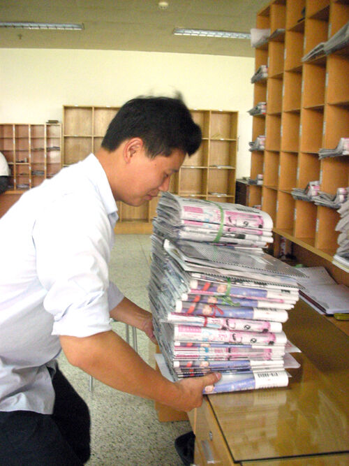31岁的吴建华1.75米的个头,皮肤白皙,生性腼腆,是个已有8年工龄、健康帅气的“绿衣使者”。由于工作出色,他多年被市邮政局评为“先进工作者”,他要承担的是第11段的报刊投递工作,任务很重。 单位规定投递员的上午正常上班时间为7:30,然而,早上7:00不到,吴建华和他的同事们都已提前到达了市邮政大楼二楼投递分局。“为了让报纸和信件快点送到用户手中,我们每天都是提前上班。”面对记者的发问,吴建华显得平静。 在投递分局,记者看到10多位投递员站在各自负责投递段的报刊分拣台前,紧张而有序地对报刊和信件进行整理分类,以便于投递。报纸在投递员的手里快速地整理分类,谁也不会分神,一心只想早点装包,早点出门送报送信。此时,不闻话语声,只有报刊信件摩擦响。在完成点数、分拣、捆扎、插报、装包等所有准备工序后,已是9:00许。 此时,“绿衣使者”出发了。吴建华身着绿色制服,骑一辆绿色载重自行车,驮着50多公斤的绿色报刊邮袋,沿越秀路出发。记者也骑着自行车与其并肩同行。