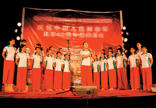 昨晚,一曲《军歌嘹亮》拉开了庆祝建军80周年文艺晚会的序幕,一台由嵊州电视台、市文艺培训学校和市消防大队主办的庆祝中国人民解放军建军80周年慰问演出在体育馆举行。图为市文艺培训学校学生演出《越剧联唱》。 ()