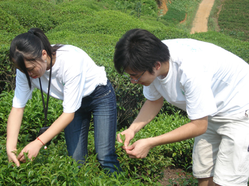 热情好客的村民看到大学生非常热情,马上捧出了一个24斤的西瓜,让大学生们感受到农家人的温暖和亲切。 下午1:30分,实践小分队向当地的茶地进发。崎岖的山路伸向大山,经过半小时才到达目的地。在茶农的帮助指导下,大学生们开始了他们的实践项目——剪茶叶。虽然烈日当空,酷热难耐,但实践队员没有被热、累、渴这些困难吓倒,一个个都坚持到最后,并且收获了很多——一袋袋的茶叶便是证明。