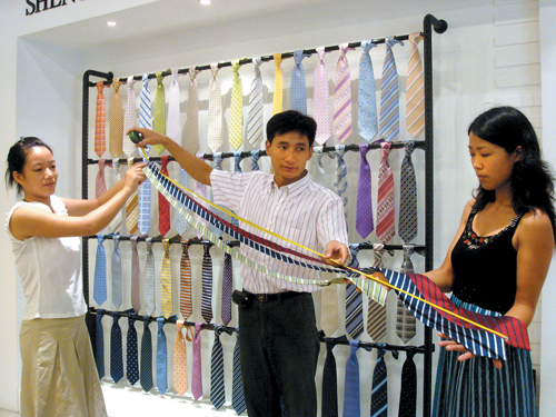 昨日,浙江风度服饰领带有限公司的技术人员正在检验已制作好的“姚明领带”。据悉,这条长达1.8米的“姚明领带”,在国内个性领带中是最长的领带。目前,该企业准备将“姚明领带”申报吉尼斯世界纪录。 走进位于经济开发区的风度服饰领带有限公司,产品展示厅墙上挂着两条“、巨大的领带,旁边还有一行小字:“风度让姚明颈上添花,我们为姚明设计制造了20款领带,这是其中的两款。”据公司总经理俞瑜介绍,“风度”公司自去年创办以来,已为国内外100多家著名服饰企业贴牌生产了数百万条高档领带,该公司也是2008北京奥运会特许商品领带的最终生产企业,目前下单加工的奥运领带已逾万条。“风度”领带的良好声誉吸引了大量品牌服饰企业前来下单,前不久,一宗特殊的生意下到“风度”公司:为著名篮球运动员姚明量身定制20款领带,这让全公司人员十分兴奋,他们精选材料,认真制作,这些长达1.8米的“姚明领带”终于出炉。 因为是最长的领带商品,俞瑜认为,作为领带之乡的生产企业,申报“吉尼斯”纪录成功的可能性很大,同时也可以更好地提高嵊州作为领带之乡的知名度。