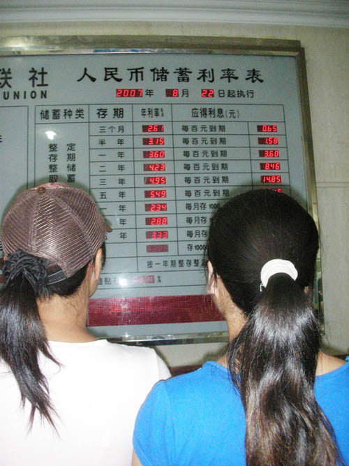 中国人民银行8月21日宣布, 8月22日起上调金融机构人民币存贷款的基准利率。金融机构一年期存款基准利率上调0.27个百分点,由现行的3.33%提高到3.60%;一年期贷款基准利率上调0.18个百分点,由现行的6.84%提高到7.02%,这是央行今年内第4次加息。图为昨天上午有市民在市农村合作银行里看上调后的利率。