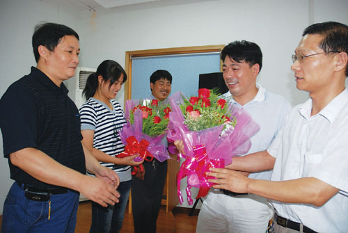 昨日下午,我市残疾人徐浩松、斯浙鹏、黄苏洁代表浙江省残疾人选手参加第三届全国残疾人职业技能竞赛载誉归来,得到市残联领导鲜花和掌声的欢迎。8月24至27日,肢体残疾人徐浩松、斯浙鹏和聋哑人黄苏洁在西安举行的第三届全国残疾人职业技能竞赛活动中,分别获得了竹编第二名、第三名和蛋糕裱装拼搏奖等好成绩。市残联领导对他们自强不息和艰苦创业的拼搏精神给予表彰,并希望他们再接再厉,能为残疾人树立起自强自立的榜样,带动他们共同致富。
