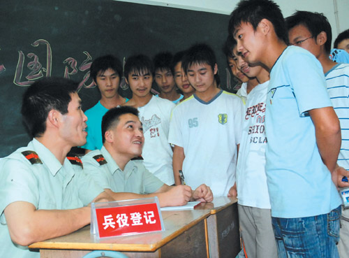 依法服兵役是每个适龄青年应尽的义务。这几天,我市兵役登记工作已在各乡镇、街道的兵役登记站展开,有万名适龄青年进站登记,参军热情十分高涨。图为9月4日市中等职业技术学校兵役登记站内,该校毕业班学生积极参加兵役登记时的情景。
