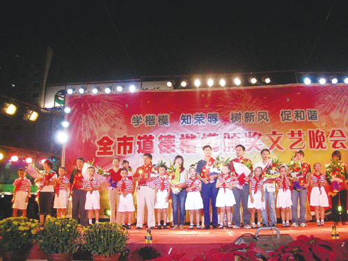9月15日晚,由市委宣传部、市文明办联合主办的“全市道德楷模”颁奖文艺晚会在文化广场举行。市领导何国英、夏春燕、杜洪苗等出席颁奖典礼并为获奖人物及其代表颁奖。 经过层层推选、社会公示和评选领导小组审定,共评选出了全市道德楷模10名,其中助人为乐、见义勇为、诚实守信、敬业奉献、孝老爱亲各2名。他们分别是:为老人带去舒适的义务修脚工史学萍,慷慨解囊的爱心使者徐孝德;诚实守信的现代企业家典范尹晓民,农村放心店标兵蒋培兴;背着母亲读中专的当代孝女吴伟燕,耐心照料瘫痪30多年丈夫的人间真爱代表李苗娟;被称为“城市美容师”的环卫工人孙勇江,执著于山区教育终不悔的优秀教师商刘敏;弘扬正气、见义勇为,为一方平安作出贡献的两位青年代表黄柯慧与宋浙中。 本次颁奖活动旨在贯彻落实《公民道德建设实施纲要》,推进公民基本道德规范实践,带动全市上下深入开展“学楷模、知荣辱、树新风、促和谐”活动。 颁奖典礼采取现场介绍与采访相结合的办法,向人们介绍和展示了这些具有代表性、时代性、示范性的全市道德楷模的动人事迹和精神风貌。