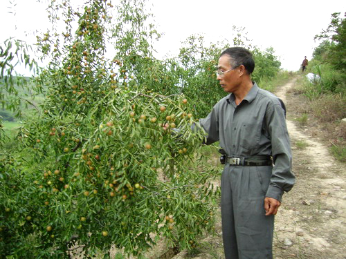一转眼到了2001年,由于公司经济效益不是很好,俞必显试种冬枣的愿望更加强烈,于是他就在黄泽镇塘家岙村承包了100多亩为期28年的这片土地。 初来此地,这里是一片荒草地,他就在这荒山上安营扎寨,白天开山,晚上就在这茅屋里借着烛光看书,翻阅培育冬枣种植的有关资料,他当时心中只有一个信念,让冬枣早日在家乡的土地上结满果实。就这样,他先后在这片荒芜的土地上投入了30多万元,把前半生中的所有积蓄全部投入在这片荒山的同时,他还向亲友借了许多钱。 经过3年的努力,首批栽下的沾化冬枣开花了,当时他喜出望外,可好景不长,过了梅雨季节,这枣树上只是一个劲地开花却不见果子,是什么原因呢?后来他又多次去山东沾化等地请教冬枣大师,弄懂了冬枣与我们本地枣在培育的方法上有许多不同,最主要的是在开花盛期有一项“环割”枣树的技术很重要,如果这项工作不到位,冬枣是很难结果的。找到了要点,又经过反复的尝试,冬枣终于能结果了。 如今,经过6年的精心培育,在黄泽镇塘家岙的山坡上已长满了甜蜜的冬枣,这是俞必显十多年追求的结晶,是他藏山六年日夜耕耘的结果。