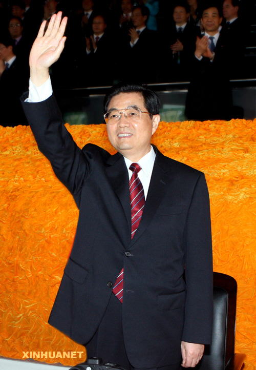 19时许,在欢快的乐曲声中,胡锦涛走上主席台,向观众挥手致意。全场响起长时间的热烈掌声。