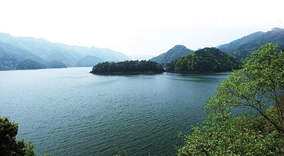 鸣棹下东阳,回舟入剡乡。 青山行不尽,绿水去何长。 地气秋仍湿,江风晚渐凉。 山梅犹作雨,溪橘未知霜。 谢客文逾盛,林公未可忘。 多惭越中好,流恨阅时芳。 唐·崔颢 《舟行入剡》 唐诗之路剡溪是古代浙东的一条风景旅游线,当年诗人鸣棹入剡之处,即今嵊州剡溪上游的南山省级风景名胜区。南山风景名胜区位于嵊州西南角,距市区30公里,面积22.38平方公里,由南山湖、天兴潭、贵门三大景区组成,是一处集密林丽湖、陡岩怪石、飞瀑悬崖、名人遗踪于一体的山水风光型旅游胜地。2006年12月在风景名胜区的基础上又设立了南山湖国家级森林公园。佳境天成南山湖 南山湖是由当年剡溪的支流南山江(西溪)截流而成,大坝高72米,坝顶长238.5米,坝底长50多米,坝顶净宽6米,坝底宽376.6米,系全国第一的土石结构大坝。高耸的水库大坝,似一把巨锁猛然将南山江这条游龙锁住,形成了高峡平湖的景观。 游人登坝远眺,只见青山环抱中,一湖烟波浩渺,广达4000余亩。湖中多岛,有龟山、象鼻山、库心屿、湖心岛……星星点点,郁郁葱葱,湖水终年清澈如镜。游人可泛舟游湖,下大坝乘舟南行,有一半岛,其顶浑圆成半球形,状若龟背。水浅时节,岛前方会露出一段狭圆形山包,极似龟头。远看全岛,酷肖一巨龟受清波碧水吸引,下山嬉水。随水涨水落,龟首浮沉,变幻多姿。湖东南一长形半岛,与龟山相隔800米,遥相呼应。全岛酷似一大象巨鼻伸入水中,作吸水状,湖水深浅适中,湖底地形平坦,是垂钓沐浴之理想所在。象鼻山南麓之盆地,三面临山,一面临湖,旧有桃林一片。每当阳春三月,和风细雨,催得桃花怒放时,树树红绿相间,花香四溢,身临其境,恍若置身桃花源中。 沿湖四周,为300公顷的国有林场,植被覆盖率达92%以上,亚热带阔叶林、混交林、池杉林颇具规模。四面群山多红枫,深秋时节,登舟泛湖,遍山红叶,层林尽染,碧水红枫相映成趣。