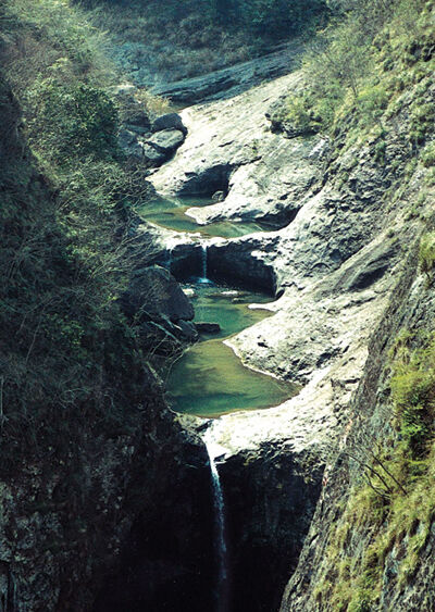天兴潭在南山湖南侧,该景区主要以奇石、飞瀑、深潭、悬岩为特色的峡谷景观。天兴潭地处海拔216米的深山野岙,三里之外即闻瀑布声,一里之隔已见瀑雾谷岚,然距十步尚不见其尊容。待寻声而至,果然是垂峦叠翠,涧流碧澄。