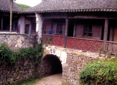 又有迎客古松五六棵,郁郁葱葱,每逢风起,松涛阵阵,分外悦耳。现在所见的更楼是清嘉庆三年(公元1798年)重修的。当地人称之为更楼洞,实则东为更楼,西为鹿门书院。鹿门书院系南宋理学家吕规叔创立。吕规叔原籍安徽寿春,年轻时与侄吕祖谦(学者称东莱先生)一同求学于著名学者杨时门下。吕规叔治学严谨,为当时之名流,曾任梧州教授、监察御史、河南府推官。因缔姻于嵊县之过氏,爱慕鹿门山水清妙,遂从婺州(今金华市)迁居鹿门,筑别墅于白宅墅,并创建鹿门书院,以培养教育乡里子弟。山阴周师濂有《鹿门书院》诗:“凿山垒石一朝成,结构精庐三十楹。规叔东莱曾讲学,到今弦诵继家声。”更楼系吕规叔之子吕祖璟所建,祖璟曾任淮南安抚使,训兵抚士,恩威诚信,颇有功绩,因与朝廷权臣不合,弃官回乡。当时浙东盗匪蜂起,为保护地方平安,祖璟组织民兵守御,建更楼演武场,如今更楼前一方坦地,即“演武场”旧址。鹿门为贵门之古称,因为那时,这里古木参天,野草丛生,时时得闻鹿鸣之声,规叔于此创建书院,故名鹿门书院。宋淳熙七年(公元1180年),时任浙东常平茶盐使的朱熹来嵊赈灾,访规叔于鹿门,并在鹿门书院讲学。朱熹与规叔素有交往,知吕氏一族家学源远流长,儒林英才辈出,堪称“文献世家,中原望族”,故题写了“贵门”两字。朱熹赋诗赞规叔道:“人道公心如明月,我道明月不如公。明月照夜不照昼,公心昼夜一般同。”朱熹是南宋理学名家,为后世所推崇,鹿门也就改名为贵门了。更楼东有芦峰,高峰插天,相传半山有龙井,深不可测,传为朱熹旧游之地。