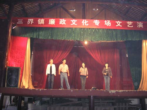 10月18日下午,三界镇政府、市文化馆联合在三界镇蒋镇村举办了廉政文化专场文艺演出,越剧、绍剧、舞蹈、小品等10多只节目精彩纷呈,用人们喜闻乐见的文艺形式宣传廉政文化,旨在构建文明、和谐新三界。