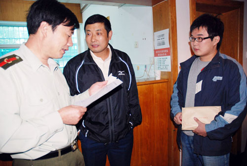 宁波万里学院计算机科学与应用本科毕业的沈汉阳,曾是宁波大学生运动会的冠军,父亲沈秋君是我市多年乒乓球比赛的冠军。这对冠军父子都有一个军营梦,昨日在父亲沈秋君的陪同下,儿子沈汉阳从容地走进了市征兵目测体检站。图为父子俩正向征兵工作人员打听体检后的消息。