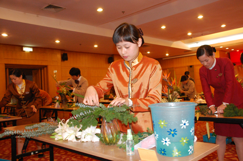 为打造一支素质过硬的四星级宾馆员工队伍,提高宾馆整体服务水准,从10月26日起,嵊州宾馆拉开了一场学技术、 比技术,人人争做技术能手的岗位练兵活动。图为岗位技术比武——插花比赛现场。