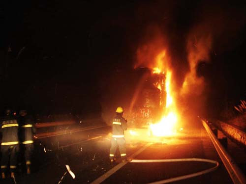 10月28日凌晨,一辆江苏牌照的货车载装着30吨废纸,从宁波镇海开往衢州常山,途经甬金高速宁波往金华方向74公里 (嵊州黄泽路段)时突然起火,经市消防大队官兵3个多小时的奋力扑救,肆虐的"火魔"终被降服,一度受阻的交通也恢复正常。 当日凌晨1点许,司机窦某突然从反光镜中看到车子起火,便急忙将车靠边,与随车的押货员下车察看情况,但由于车上载装的全是废纸,火势迅速蔓延开来,两人情急之中就拨打了报警电话。 事发后,当地高速交警、消防官兵第一时间赶到现场处置。此时,货车几乎成了"火车",燃烧非常猛烈,给过往车辆带来不便。高速交警立即实施分流,以防发生车辆事故;消防官兵马上出水枪进行扑救,控制火势蔓延。 由于高速上水源缺乏,消防官兵只好采取运水供水的方法进行灭火,一辆消防车在现场负责供水,另一辆消防车下高速负责加水,以确保灭火的用水量。很快,消防官兵控制了火势,明火也基本扑灭,但车上都是严严实实包装的废纸,里面可能存在阴燃,给消防官兵快速灭火带来一定的难度。于是,消防官兵爬上车顶进行近距离灭火,到3时左右,余火被彻底扑灭。 直至上午9时许,现场清理完毕,交通恢复正常,火灾原因及损失情况目前有关部门正在调查之中。