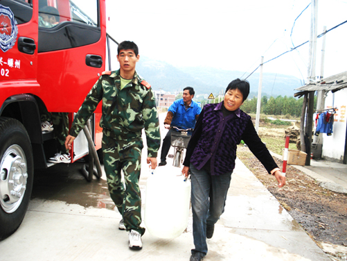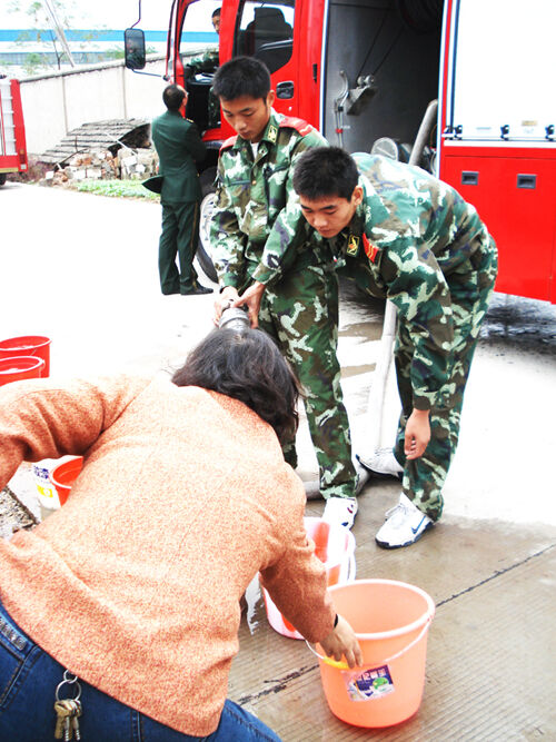 11月1日上午,三江街道桥里村主水管因附近工程施工疏忽被掘,造成该村900村民生活用水中断,市消防大队在得知这一情况后, 迅速派出消防车为驻地群众无偿提供生活用水,解决了群众的燃眉之急。 当日上午9点20分左右,市消防大队接到市政府的送水通知后,大队长何国良立即指派中队指导员朱荣军带领两辆水罐消防车7名队员运送11.5吨水,第一时间赶到桥里村。官兵们来到村口,车未停稳,村民们便提着水桶、水盆等,蜂拥而上,将消防车团团围住。 “大家都别挤,每个人都有份儿的。”见此情景,消防官兵与村干部进行沟通,维持好秩序。盛水的“工具”整齐地摆放在消防车旁,清澈、明亮的水柱从水带里不断注入水桶、水盆中。为了方便群众接水,消防官兵一边维持秩序,一边帮村民接水。有的官兵衣服被水溅湿了,但没有任何怨言,对一些老幼病残行动不便的居民,消防战士还帮助送水到家。 村民们接到消防官兵送来的“及时雨”,一个个都露出了灿烂的笑容。该村村长施梅桥端着一盆清水,满含深情地连声感谢消防战士:“这真是军民鱼水情,与海一样深啊!”在送水过程中,消防官兵想百姓之所想,及时解决了村民的实际困难,直到自来水公司将供水管道修复后,消防官兵才悄然离去。
