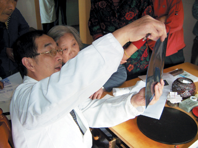 走进张淞生的门诊室,但见小方桌四周早已围满了病人,“人丛”中,六十一岁的张医师正凝神给一位周姓病人诊脉、验苔——这位来自市区的颈椎病患者,今天已是第三次来这里了,前两次,一次是没碰上,还有一次则是病人太多,等不及回家了。
