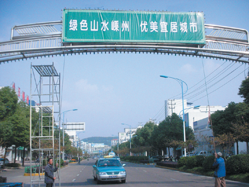 近日,我市将接受创建省级园林城市考核验收。随着迎检时间的临近,我市有关部门在前期创建的基础上,对基础设施、市容环境、交通秩序等方面进行综合整治。目前,“创园”各项基础性工作已基本准备就绪。图为工人们正在官河路上悬挂“绿色山水嵊州,优美宜居城市”的横幅。