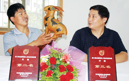 昨日,从市残联获悉,我市肢残竹编艺人徐浩松,受日本第七届国际残疾人职业技能竞赛组委会的邀请,前往日本参加在静岗举行的第七届国际残疾人职业技能竹编比赛。 据悉,国际残疾人技能大赛是国际上最高规格的残疾人技能比赛,每四年举行一次。我省参加此次比赛的选手仅为两名。 徐浩松是市浩男工艺竹编厂厂长,今年41岁的他已在工艺竹编行业苦干20多年。今年8月,他参加了在西安举办的第三届全国残疾人职业技能竞赛,获得竹编第二名的好成绩,喜得了我市首枚肢残竹编艺人全国大赛的银牌。上图为今年8月徐浩松(左)比赛得奖时的情景。