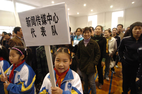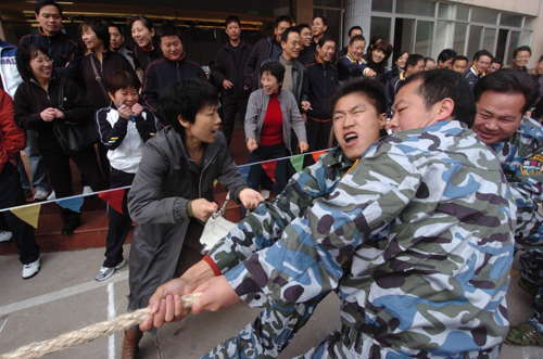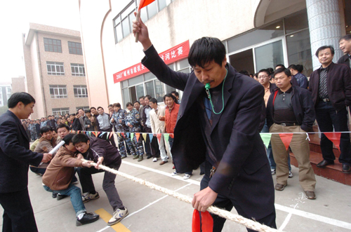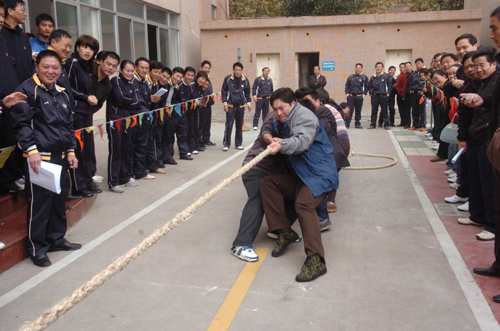 今天上午8时,2007’市级机关运动会在城北小学开幕,全市61支代表队,1000多位运动员参加了开幕式,这次运动会共设乒乓球、羽毛球、跳绳等8个比赛大项目。这次运动会的宗旨为增强机关干部身体素质,活跃机关文化生活,营造机关和谐氛围,促进机关各项工作开展,运动会的主题是“参与、和谐、健康、超越”。市委常委、组织部长朱晓董参加开幕式并宣布运动会正式开幕,市人大副主任陈自军、副市长夏春燕、政协副主席杜洪苗参加了开幕式。图为运动会中拔河比赛的场景。