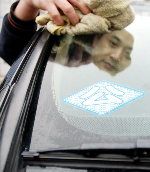 为规范公务用车,近日我市各级党政机关的公务车辆,在前挡风玻璃内加贴统一设计的“公务用车”标识。图为昨日市财税系统的驾驶员正在擦拭贴有“公务用车”标识的挡风玻璃。