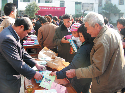 昨日上午,一辆面包车开进了地处深山的里南乡敬老院,车上下来一群特殊的客人,他们是市政协的有关领导和市政协企业家之友社的几位企业家。一走进敬老院,几位领导和企业家就捧起一条条崭新的棉被,挨个地向敬老院老人的怀里送,并祝老人们身体健康、晚年幸福。 这是市政协昨日在里南乡开展“五下乡”的活动内容之一。本次活动,市政协组织了教育、科技、卫生、文化、司法等有关部门,及政协企业家之友社、政协书画院的政协委员、专家、名医、名优教师、书画家和演员等一同参加,为山区的群众送去各方面的知识。 上午9点不到,作为主活动场地的里南乡中心小学操场上已经很热闹,宣传画前吸引了众多村民观看,一字排开的咨询台前也围起了人群,有些心急的村民手里已经拿了不少宣传资料。一位叫张景达的村民是走了3里地赶来的,他拿着资料高兴地说:“这些知识我们都很需要,这样的活动我们很欢迎!”市交警大队送去了1500多本有关交通安全警示方面的书籍,不到一上午,就分发一空。 据悉,本次活动中,市政协企业家之友社还向里南乡赠送了35000元资金,用于支持山区的教育文化事业;城北小学和罗星幼儿园则分别与里南乡小学、中心幼儿园开展结对帮扶,各赠送助学款5000元;市卫生局则组织有关专家名医,开展义诊,并为特困户及行动不便的老人免费送医送药上门服务…… 市政协主席王生灿,副主席王灿林、张金初、袁辉尧、杜洪苗、丁法军参加了本次活动。