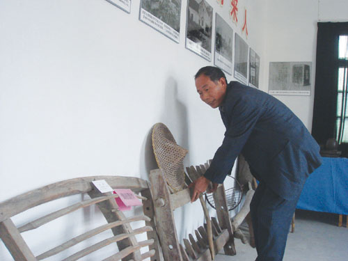 下王镇地处山区,外出打工是许多村民选择的致富之路,这造成了该镇的留守学生较多。镇老年退干协会针对这一现状,在老年活动室专门设立了革命传统教育陈列室,陈列着战争年代老区人们与敌人英勇战斗的事迹和老区人们勤劳耕种的工具。陈列室每逢双休日向留守儿童开放,并派出专门人员向孩子们讲解老革命的故事,让他们更加热爱生活、热爱劳动。图为该镇退干活动室主任童享良正在将收集到的耕种工具放在陈列室。