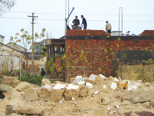 甘霖镇求家坎村今年以来大力度拆除空心村,至今已经拆除旧房面积12000平方米。图为村民在拆除的屋基上重建新房。