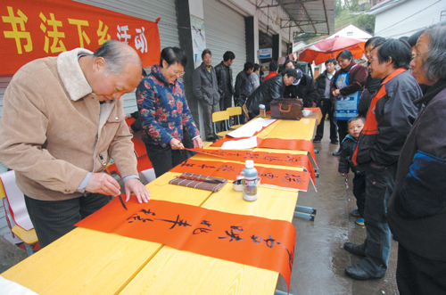 短短半天时间,活动就吸引了该村近百名村民前来参加,大家围着书法家们,争相索要对联。市文联副主席钱子浪告诉记者:“为学习贯彻十七大精神,我们组织了这次送书法下乡活动,服务群众,方便群众,丰富群众的精神文化生活。”