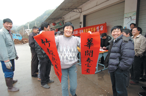 昨日上午,市文联、书协送书法下乡活动在通源乡松明培村举行,活动受到了山区老百姓的欢迎。 听说市文联组织送书法下乡活动,村民钱香娟显得特别开心。她告诉记者,过段时间女儿就要结婚了,刚好可以写副对联喜庆喜庆。捧着书法家给她写的:“永结同心,鸳鸯千载合,鸾凤百年和”,她高兴得合不拢嘴,连声说“谢谢!”村民宝芬第一个拿到书法家给她写的春联,她双手拿着“花开春富贵,竹报岁平安”对联说:“元旦快到了,写副对联到家里去贴起来,很喜庆的。”