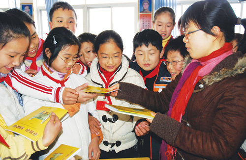 国学《论语》在现代教科书中的篇幅越来越多,为让学生加强对《论语》的阅读,长乐镇把民间古训编印成册分发给中小学生阅读,成为全市首个民间古训与《论语》 伴读的乡镇。图为12月20日长乐中心学校首次向学生分发《民间古训》。
