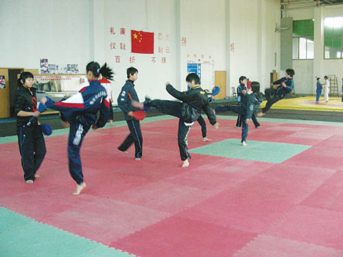 为积极备战明年省、市的各类锦标赛,迎接2008年北京奥运会,市体育学校的皮划艇、拳击、跆拳道、柔道、武术等各专业运动队积极开展冬训工作。图为训练场景。