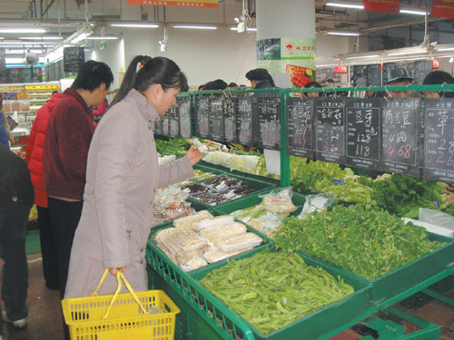 买菜就去农贸市场的传统习惯现在得到改变。市区几大超市去年以来净菜经营的规模越来越大,品种越来越多,甚至连猪肉摊也搬进了超市。图为市民正在三江超市选购蔬菜。