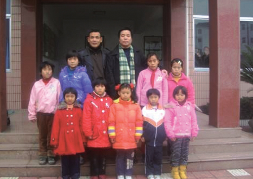 12月22日上午,上海银磐投资管理有限公司总经理钱晓思先生专程回到家乡长乐,给结对资助的十名家庭贫困的小学生每人送上了1000元助学金,鼓励他们好好学习,如果能够考上大学,他愿意资助他们读到大学毕业。图为钱晓思先生(后排右3)和小学生合影。