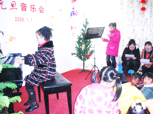 元旦前夕,90多位天韵艺术培训中心的学员,用二胡、黑管、萨克斯、钢琴等乐器表演了《贝多芬奏鸣曲》、《乒乓变奏曲》、《星光圆舞曲》等中外名曲,欢庆奥运年的到来。