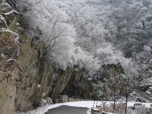 天好心情好:今天我们到四明山看雪去了,雪好大呀,还有雾凇。 今日嵊州:这几天很冷,但是市区没有下雪,很遗憾。四明山上雪景美吗? 天好心情好:太美了,现在的深山已是另一个世界,到了现场,你会情不自禁地尖叫。就像我们一起去的一个女同志说的那样:活三十了,这么壮丽的景观还是第一次见到(如图)。 今日嵊州:你们是从哪条路线上去的? 天好心情好:从下王镇的高山村上去的。那个村子的屋顶上也都是雪。我们还看到沿途的腊梅花开了,红白相映,真美啊! 今日嵊州:呵,听你这么一说,还真想去看看啊。 天好心情好:如天气不变暖的话,这样的景色会持续几天吧。如果去的话,要注意安全哦。去的时候天气也不能太冷,不然路上结冰,车子打滑。“小面包”太轻,小汽车好点,最好越野车。 今日嵊州:好的。谢谢你哦。