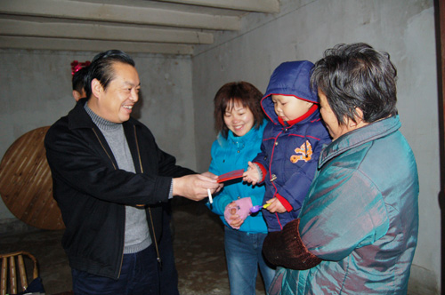 图为俞仲兴为东联村白血病患者,年仅3岁的叶锦南小朋友送去慰问金