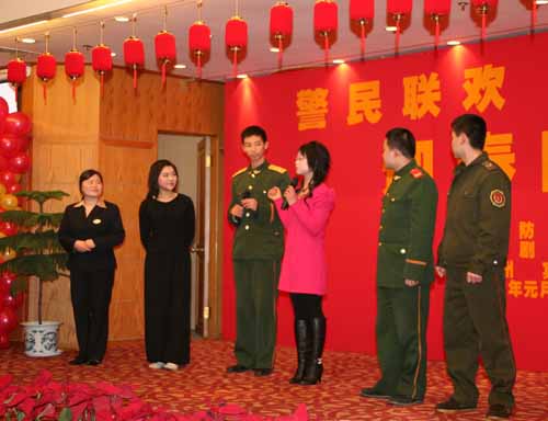 劲舞福开门,灵鼠献瑞来。迎着2008年的第一场雪,市消防大队、嵊州宾馆、越剧艺校三家单位于1月17日在嵊州宾馆举办了以“警民联欢、共建和谐”为主题的迎春晚会。整个晚会主要以歌曲、小品、越剧、诗朗诵等多种形式,表达了拥军爱民的浓浓鱼水情。