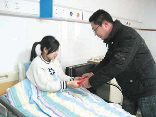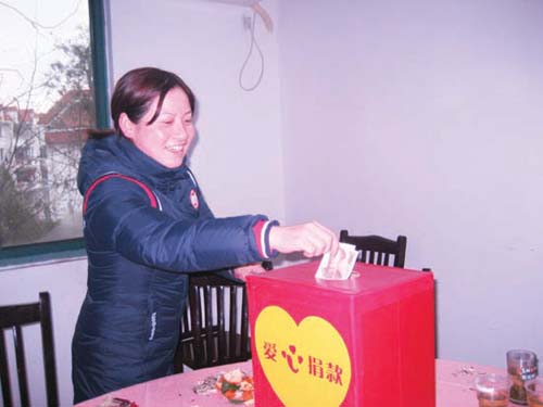 1月22日上午,市人民医院内科大楼8楼血液科的病房内发生了感人的一幕,网友“和平山庄涌哥”把一个包含众多网友爱心、内装3420元捐款的红包交给了身患白血病的少女范丹青(本报曾作连续报道),网友“禾田广告”还把一束鲜花放在范丹青的病床边。 “和平山庄涌哥”交给范丹青的红包是青年驴舍俱乐部QQ群众多网友的捐款。前几天,青年驴舍QQ群的网友在聚会时,网友“和平山庄涌哥”、“丰田”倡议:将要过年了,大家能否以自己的行动来帮助一些有困难的人,这个提议立即得到了众多网友的拥护。“和平山庄涌哥”还是《今日嵊州》“想说就说QQ”的网友,他在和本报记者的聊天中了解到范丹青家境贫寒、又身患白血病的情况后,就决定为她组织一次捐款活动。 几天后,青年驴舍俱乐部的QQ群里出现了这样一则群公告:“各位群友,在新年即将来临之际,我们群组准备搞一次爱心捐款活动,让我们用自己的行动来帮助白血病少女范丹青,为她组织一次捐款活动吧!捐款时间:1月19日~20日,捐款地址:荷坪山庄。” 1月19日~20日下午,天淅淅沥沥地下着小雨,冰冷的雨水让人感到刺骨的寒冷,但在荷坪山庄内却涌动着阵阵暖流,众多网友冒雨前来为范丹青捐款。
